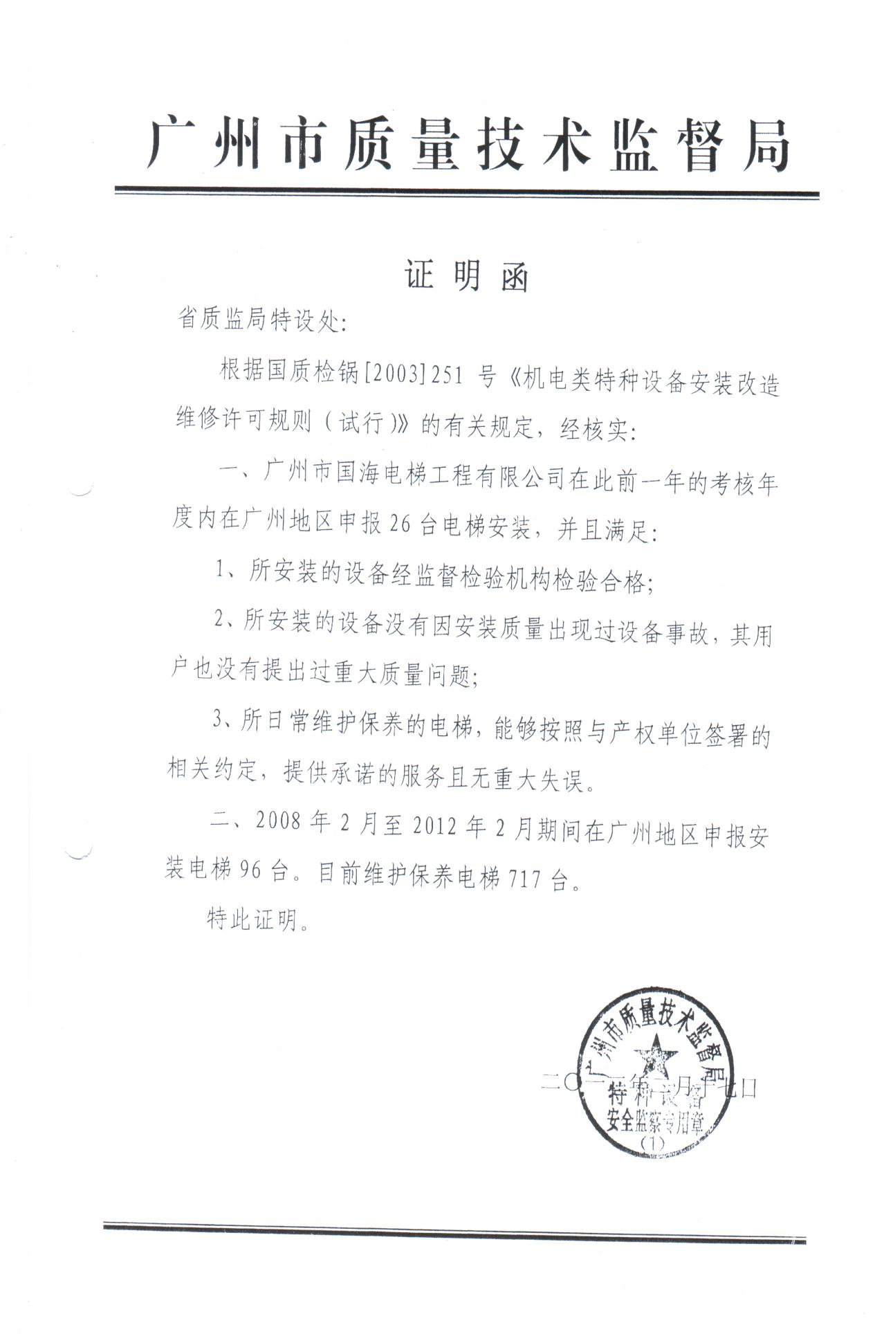 廣州市國(guó)海電梯工程有限公司是經(jīng)市場(chǎng)監(jiān)督管理局認(rèn)證的特種設(shè)備A級(jí)企業(yè)
